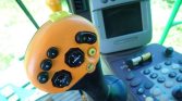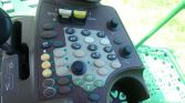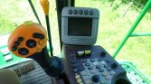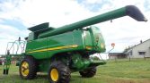 The interior is equipped with AC and heat. Features include a variable speed feederhouse, large wire concaves, a straw chopper, bin extensions, and a 22-foot unloading auger. Tires are 520/85R42 on the front and 28L-26 on the rear with duals. Notes indicate that the duals…